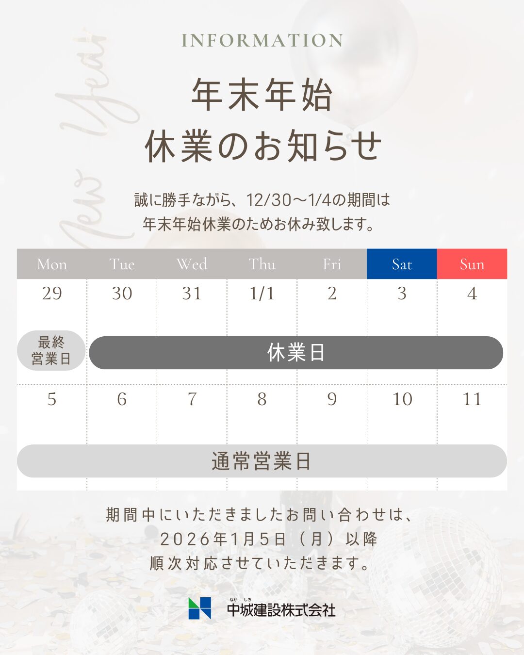 平素より中城建設をご愛顧いただき、誠にありがとうございます。誠に勝手ながら、下記の期間を年末年始休業とさせていただきます。