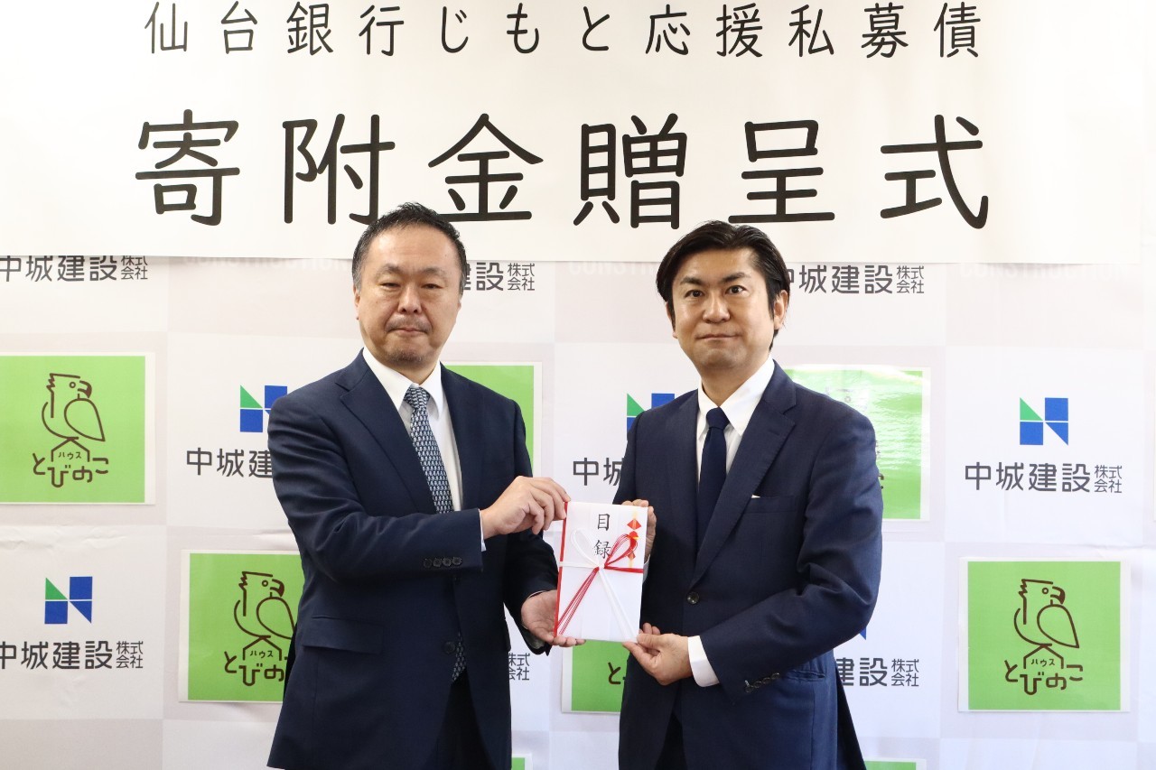 仙台銀行「じもと応援私募債」の発行に伴い、仙台市中山にある多世代交流施設「とびのこハウス」様へ寄贈し、先日寄附金贈呈式を行いました。