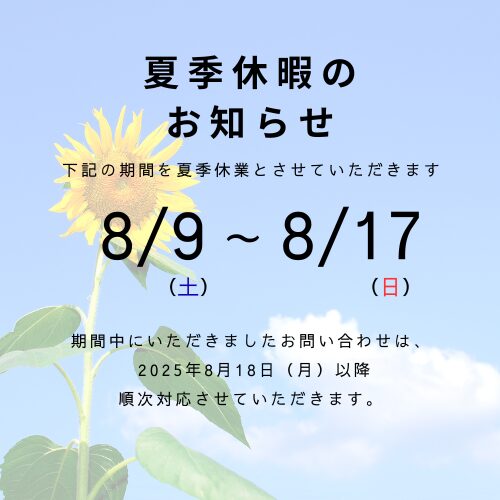 ■夏季休暇期間2025年8月9日(土)~8月16日(日)