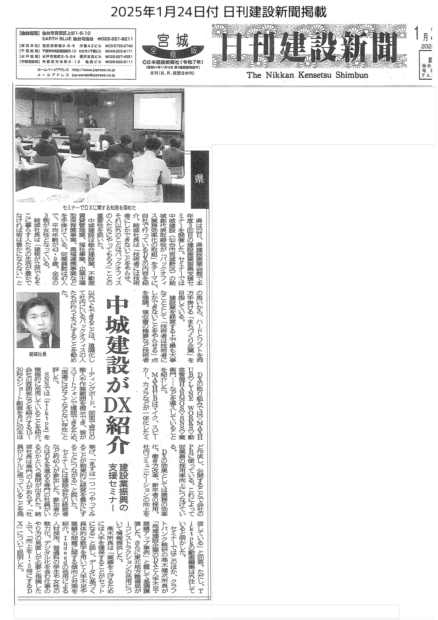 宮城県が主催する建設産業振興支援セミナーに結城社長が登壇した際の様子が2025年1月24日付の日刊建設新聞にて掲載されております。