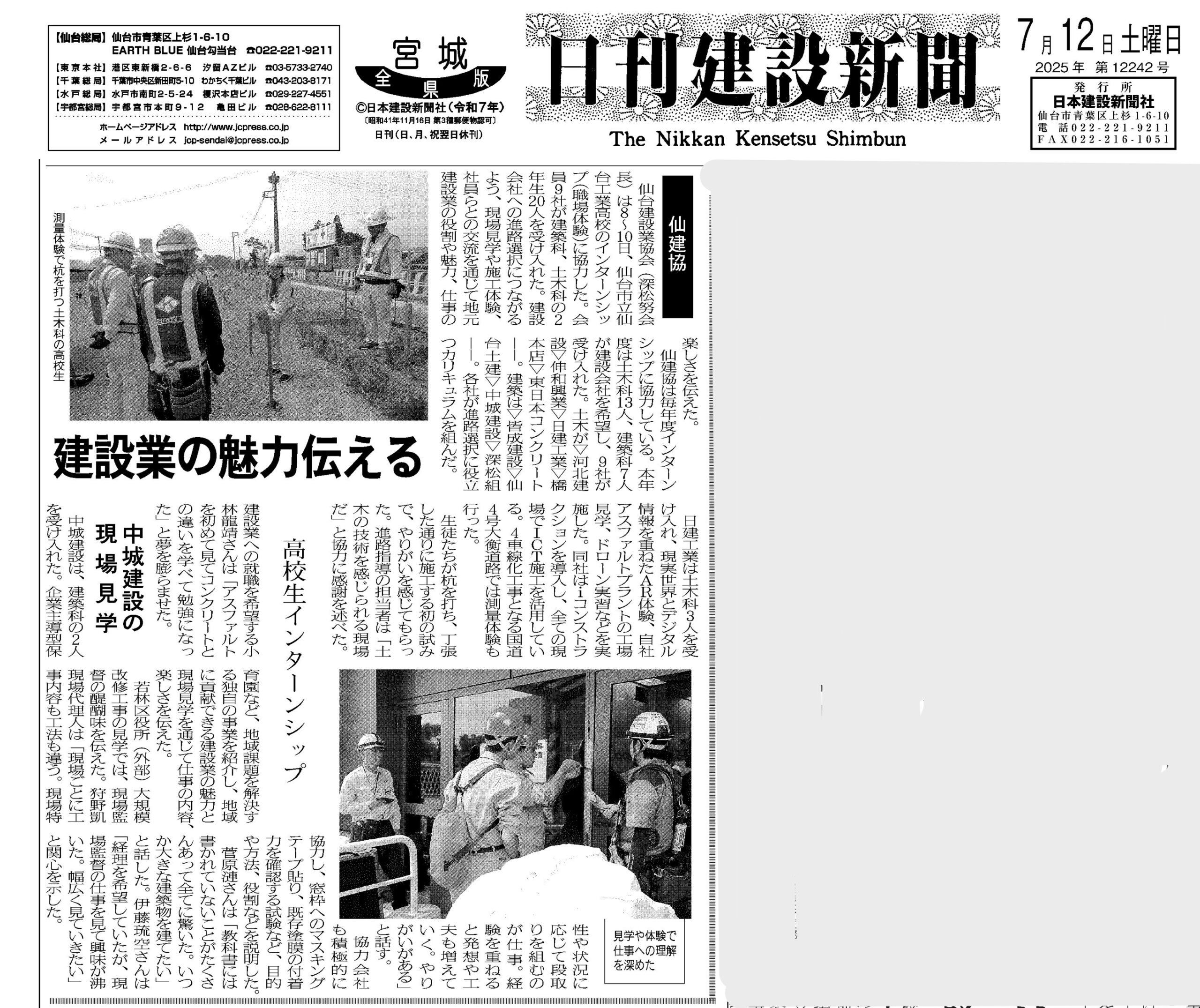 先日、日刊建設新聞にて当社インターンシップの様子が掲載されました。参加学生のリアルな体験の様子が紹介されています。ぜひご覧ください。