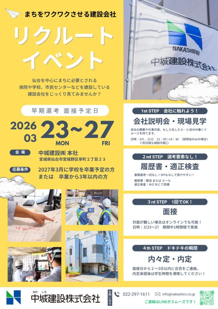 中城建設では、2027年3月卒業予定の学生の皆さまを対象に、業界理解を深めていただく各種イベントを開催いたします。